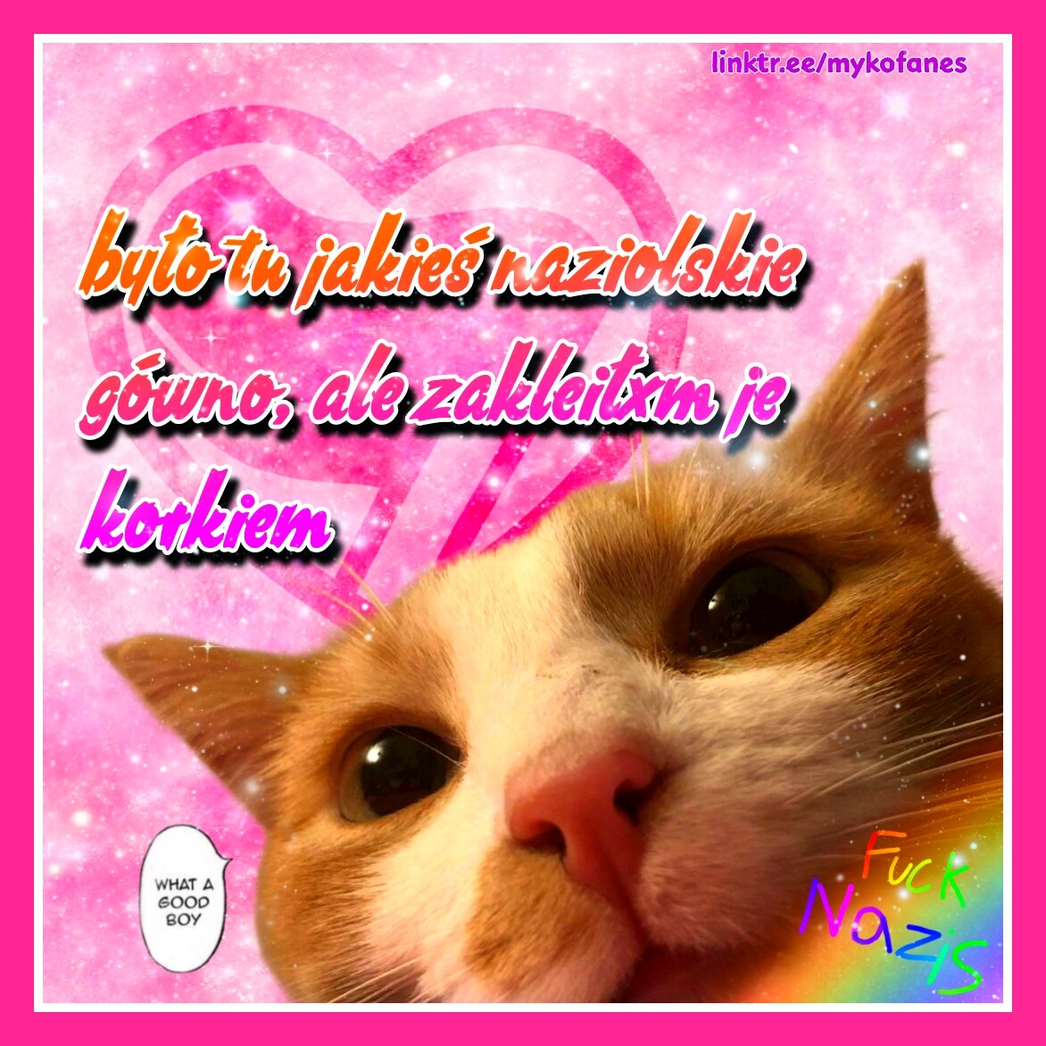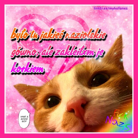 Alt text: text in Polish in three lines coloured orange, red pink and purple: there was some nazi shit but I covered it with a kitty. Closeup of orange cat face. He looks silly. In the right bottom corner rainbow with rainbow text Fuck Nazis. Pink glitter background with transparent anti-fascist action in heart. Second picture is the same, but instead there is name of the cat - Berk - instead of kitty.