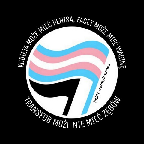 Alt text: Transgender flag and behind it smaller black flag in white circle on black background (antifascist action pattern). Around circle white text in Polish