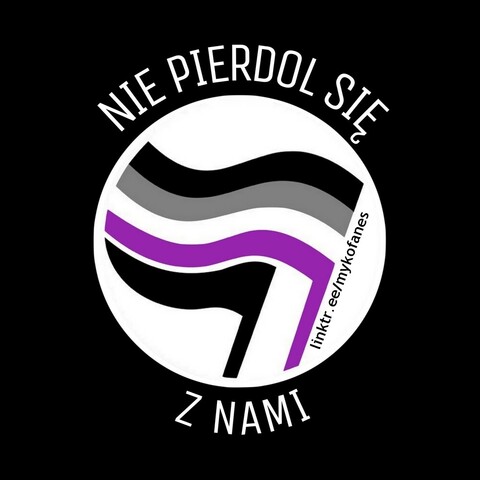 pl: flaga aseksualna i za nią mniejsza czarna flaga w białym kole na czarnym tle (wzór akcji antyfaszystowskiej). Wokół koła biały napis "Nie pierdol się z nami"