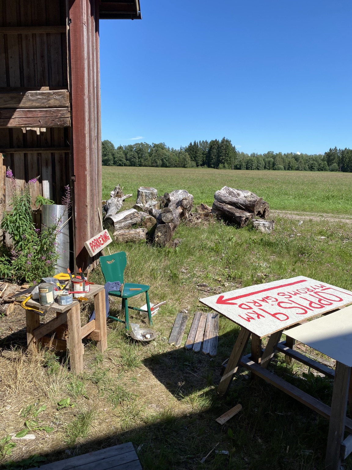 Dag 4. Idag har vi gjort klart loppisen för öppning. Målat skyltar och satt upp längs vägen ut till gården. Dessutom har vi klippt häck, trimmat kring ladugården och rensat färdigt i slaktboden. Nu är det bara resten av magasinet kvar. Dessutom åkte vi och besiktigade husvagnen som gick igenom, hurra!