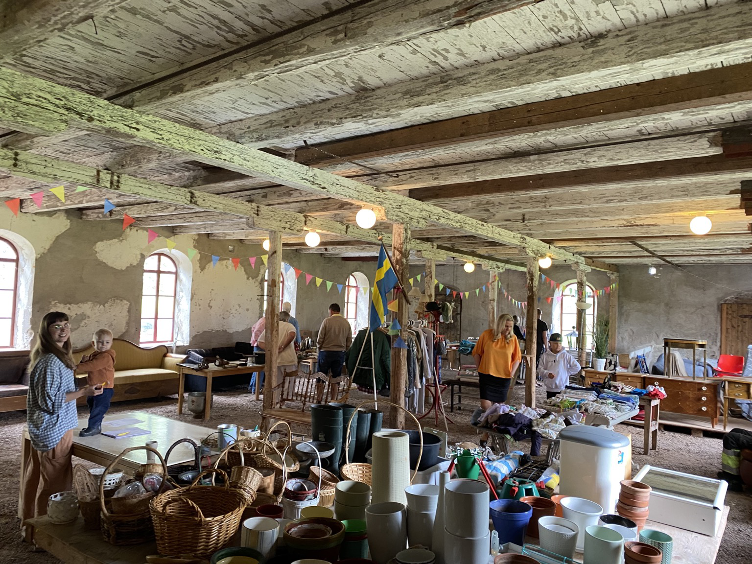 Dag 10. Idag blev det till att ta reda på det som var kvar på gräsmattan från gårdagen och det blev tillsist tomt. Loppisen rullade på idag med många besök. Grusgången rensades av Maja och Isak som dessutom hann med att plocka lupiner. Stallets södra sida rensades ut för att få plats med vinterns småved. Snart kan vi dra igång vår lånade superpilke och göra småved!