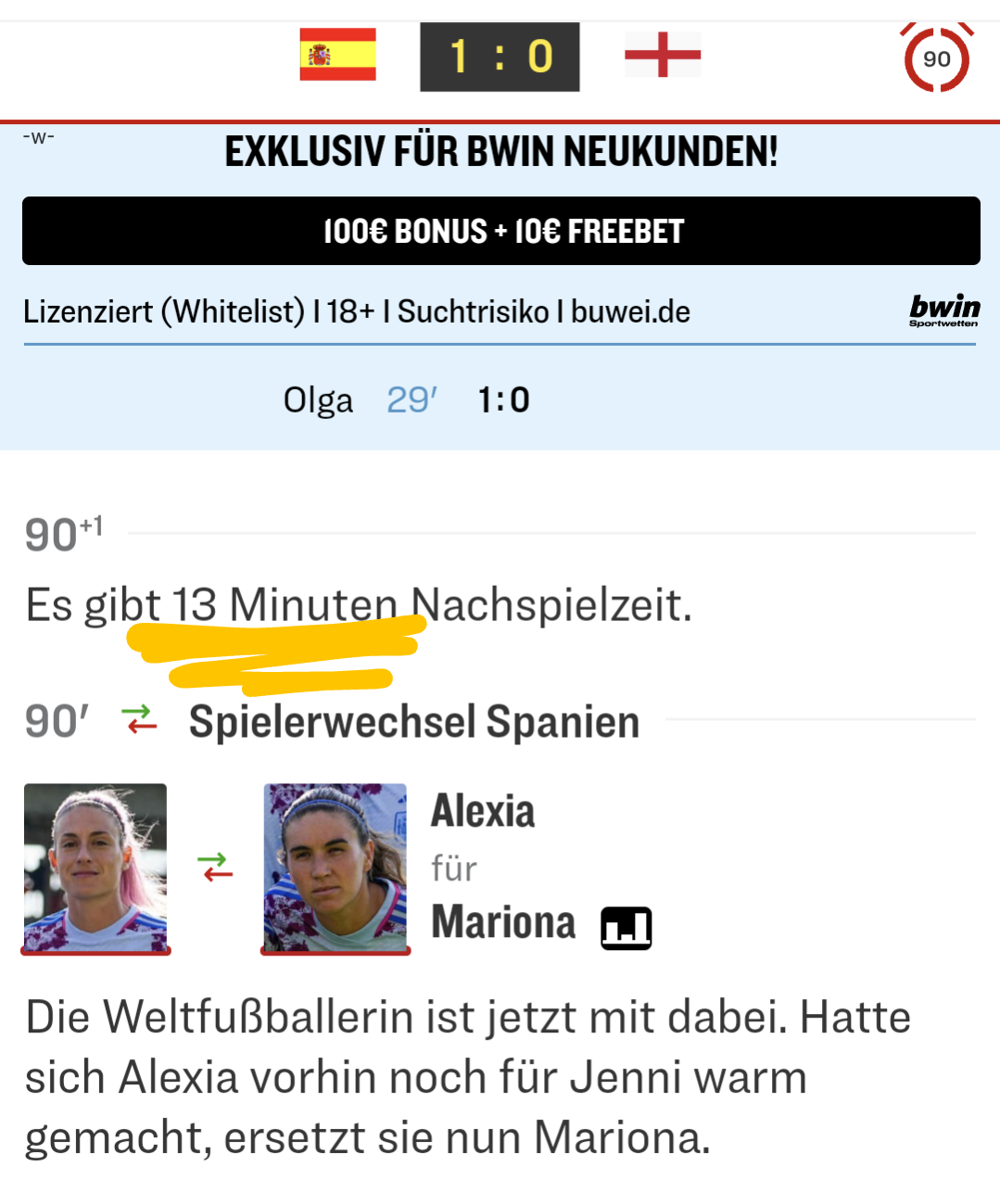 Sorry, aber 13 Minuten #Nachspielzeit ist albern. Ich habe das Spiel nicht gesehen, entnehme dem Ticker aber keine Unterbrechung wegen Gewitters oder so. Statt so lange nach Ermessen der Schiedsrichterin nachzuspielen, wäre eine #Nettospielzeit sinnvoll, wo in bestimmten Situationen für alle erkennbar die Uhr angehalten wird, bspw. bei Auswechslungen, bei Verletzungsunterbrechungen und nach Toren.