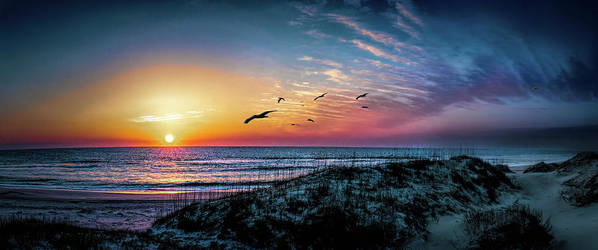 Nags Head, North Carolina beach sunrise, sand dunes and pelicans in flight in an iconic panorama photo here: