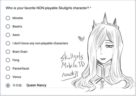 I took the Skullgirls Mobile survey. My favorite character is naturally Queen Nancy. My ID is nouskjp. I can only exchange gifts, but players are welcome to register if you like. #skullgirls #nancyrenoir #milf