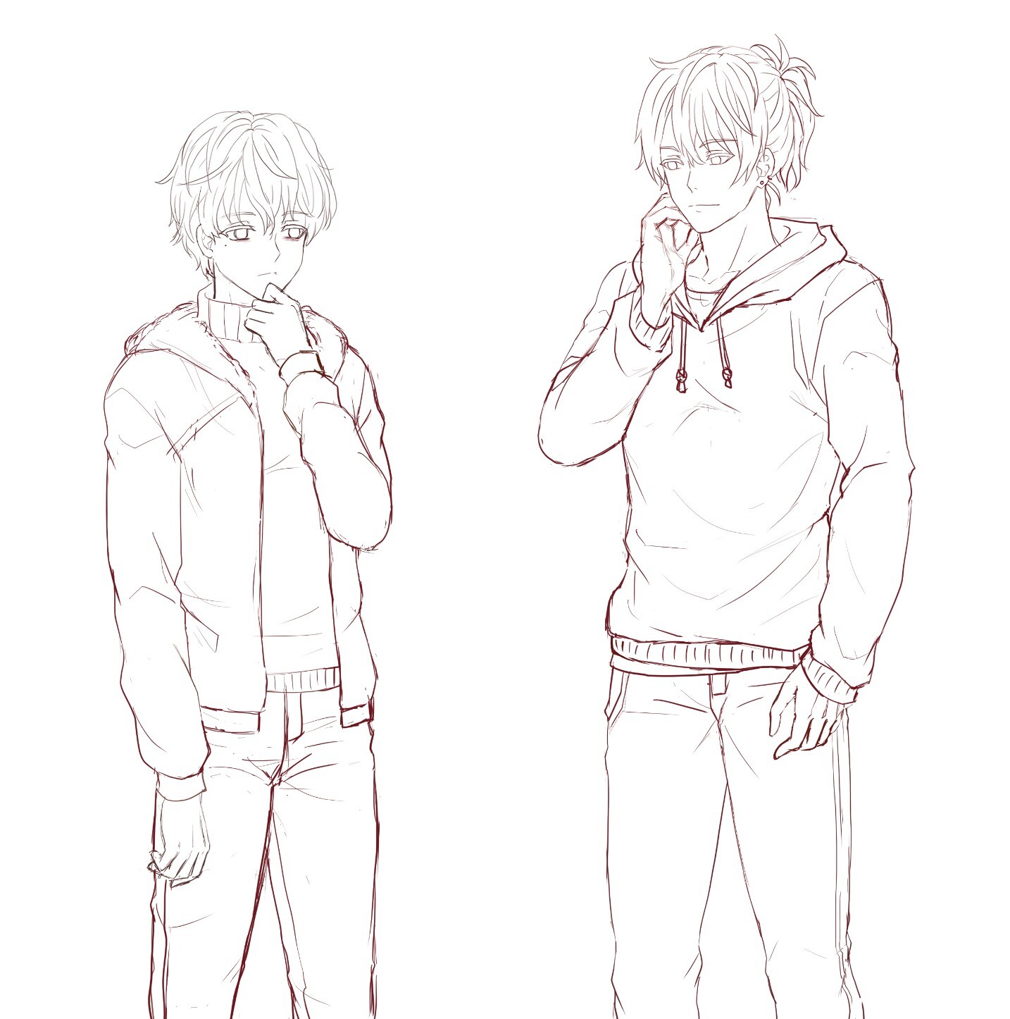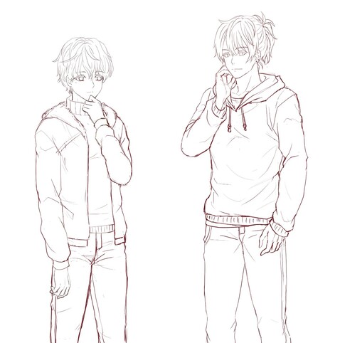 Here are some sketches of the two main (and, uh, only) characters, Noah and Mikage, drawn by the talented Saitoki!