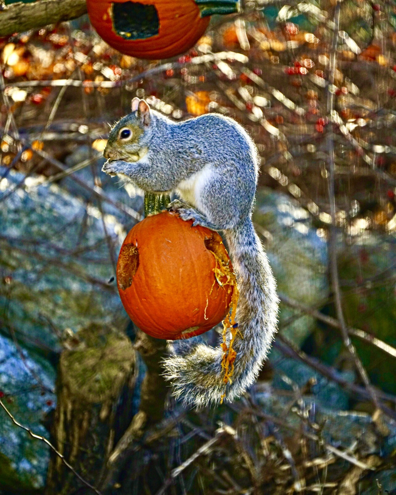 We had an Eastern Grey Squirrel campout on one of the Pumpkins and eat most of the bird seed that was placed inside.