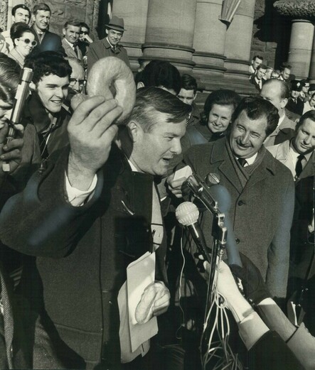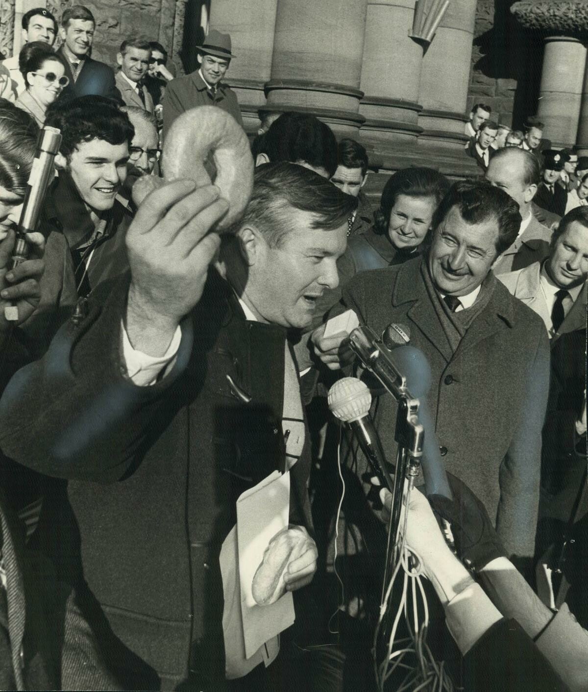 University Affairs Minister Bill Davis, and future premier of Ontario, holds up a bagel he was given by one of the 700 University of Toronto student demonstrators at Queen's Park on Nov. 20, 1968.