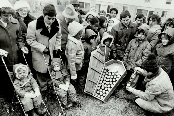 Residents of Scarborough's McClure Crescent gather radioactive soil in mason jars to symbolize the 1st anniversary of action being promised to get rid of their soil, on Nov. 22, 1981.