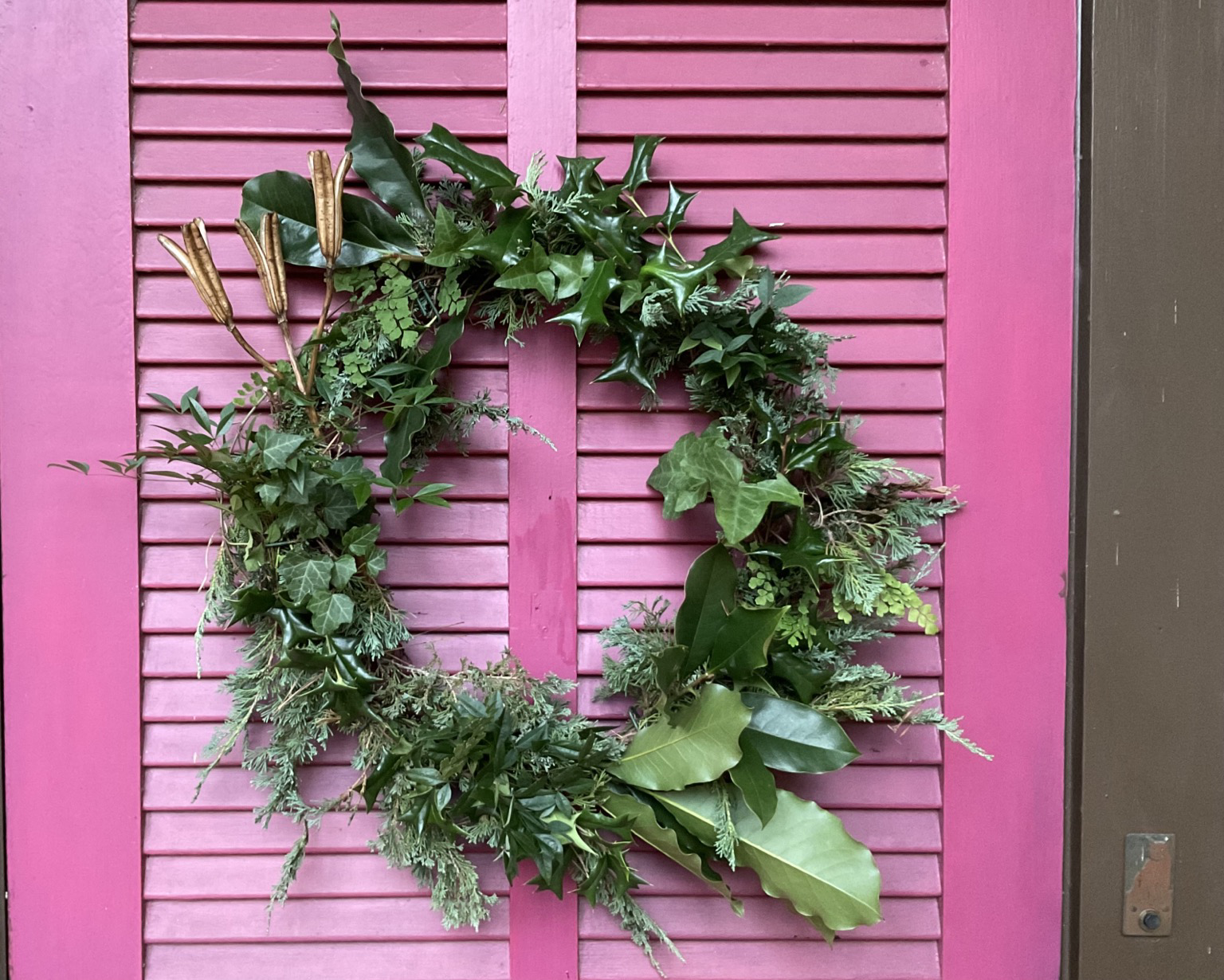 Just made our holiday wreath from garden cuttings. Same metal wreath form for years, filled with creeping juniper, magnolia, holly, nandina, ivy, maidenhair fern, and lily seed pods that look like candles. Good 2-for-1 activity, because most of these Iām trying to get rid of to replace with native plants. #WinterSolstice #Wreath #ChristmasDecor #NaturalDecor #weeding