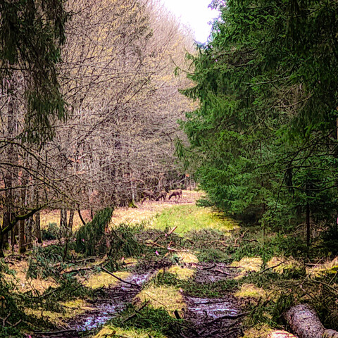 Das Aprilwetter ist uns beim Waldspaziergang ungefähr genau so egal wie den drei Rehen die Forstarbeiten mit schwerem Gerät, keine 150 Meter von ihnen entfernt.