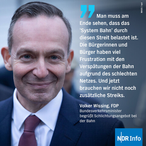 Es sei klar, dass die Bahn attraktive Arbeitsplätze anbieten müsse, um dem Fachkräftemangel entgegenzuwirken und auch, dass diese Arbeit angemessen bezahlt werden müsse, sagte er im Interview mit NDR Info.