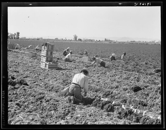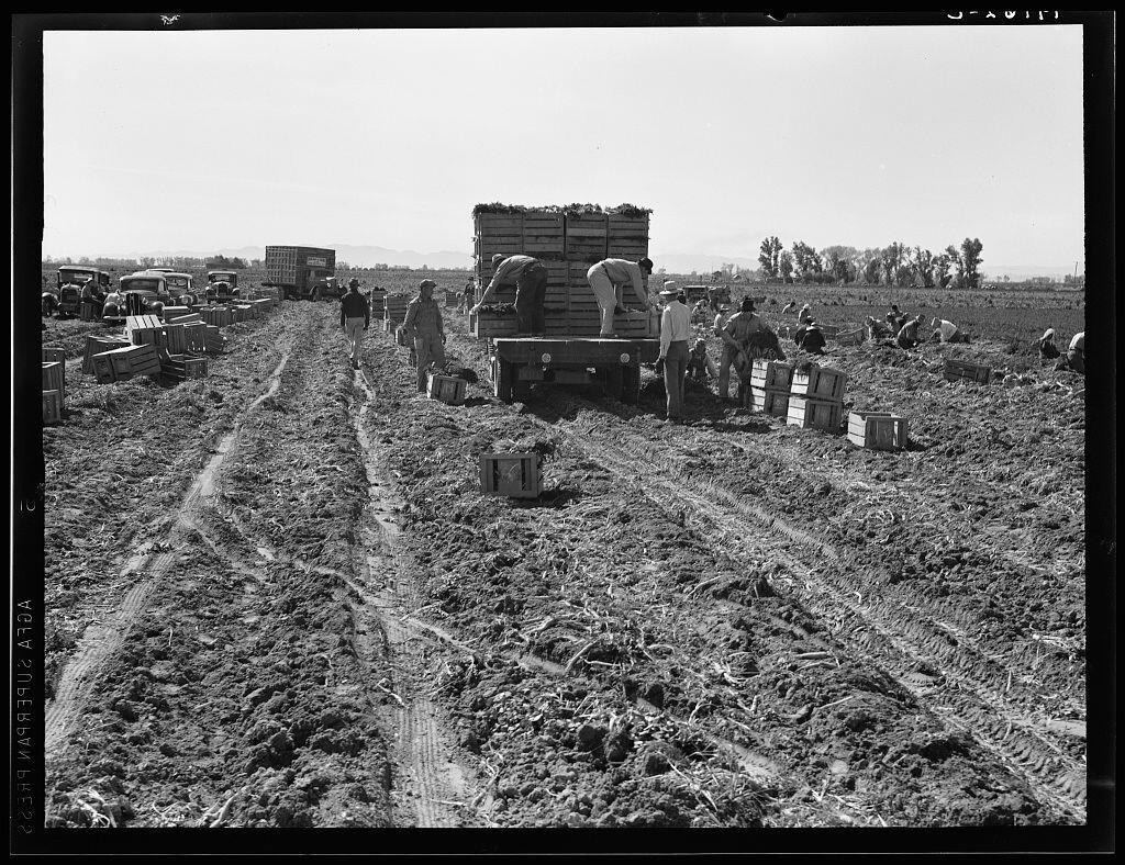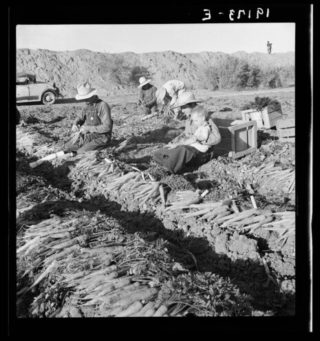 Large-scale agricultural gang labor, #Mexicans and whites from the #Southwest pull, clean, tie and crate carrots for the eastern market for eleven cents per crate of forty-eight bunches. Many can make barely one dollar a day. Heavy oversupply of labor and competition for jobs is keen. #NearMeloland, #ImperialValley