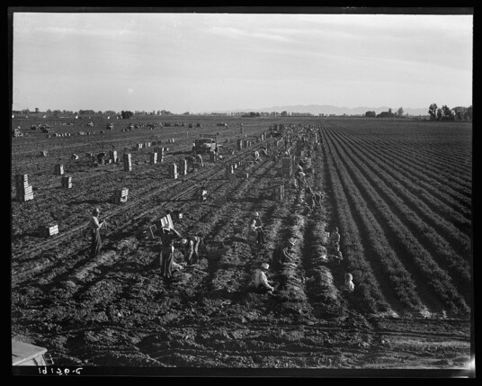 #NearMeloland, #ImperialValley. Large scale agriculture. Gang labor, #Mexican and white, from the #Southwest. Pull, clean, tie and crate carrots for the eastern market for eleven cents per crate of forty-eight bunches. Many can make barely one dollar a day. Heavy oversupply of labor and competition for jobs is keen