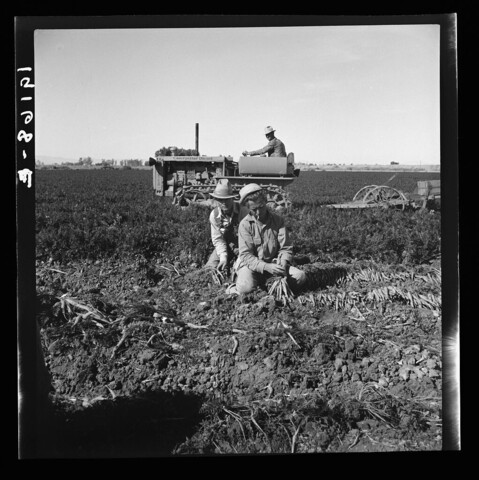 8 a.m. #Migratory field workers pulling carrots in a field. Note carrot digging tractor in background. "They'll sleep in the row to hold a place in the field) to earn sixty cents a day." #NearMeloland, #ImperialCounty, #California