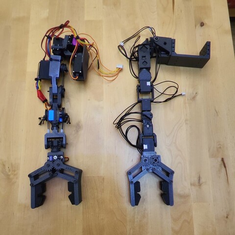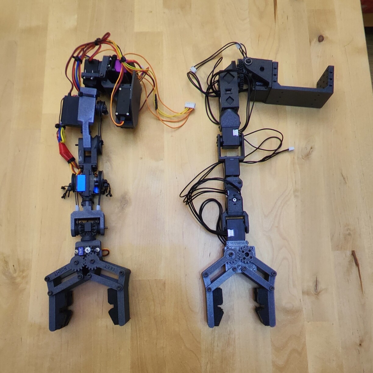 Massive update to #nefive! His old arm on the left, new arm on the right. Almost the same dimensions but with an extra degree of freedom and ROBOTIS Dynamixels throughout! So incredibly happy with how this is coming together! #robotics #3dprinting