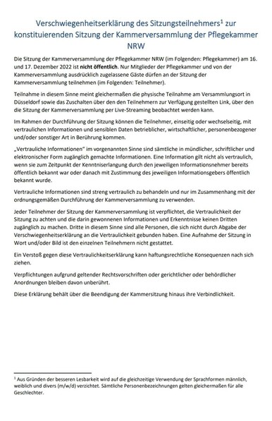 Die PflegekammerNRW, auch Pflegeparlament genannt ist da. Ob gewollt und sinnvoll oder nicht. Gestern und heute fand die konstituierende Sitzung statt. Die Transparenz des "Pflegeparlaments" sieht so aus, dass die Sitzung nicht öffentlich stattfand und nicht über Inhalte gesprochen werden darf.