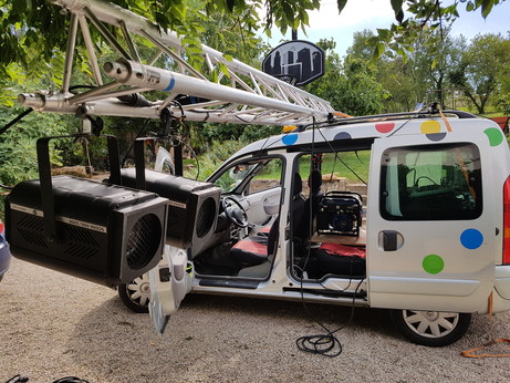 Pour un tournage comprenant un travelling, sur une route, en lumière artificielle, on a équipé le Disco-Kangoo :