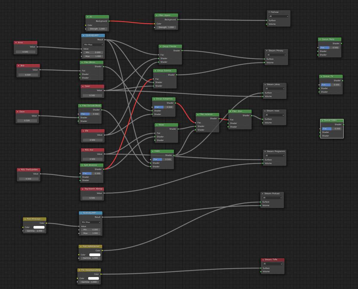 The sources are wired into groups which can also be filtered, including positive boost-filters to make them skip to the top of the queue.