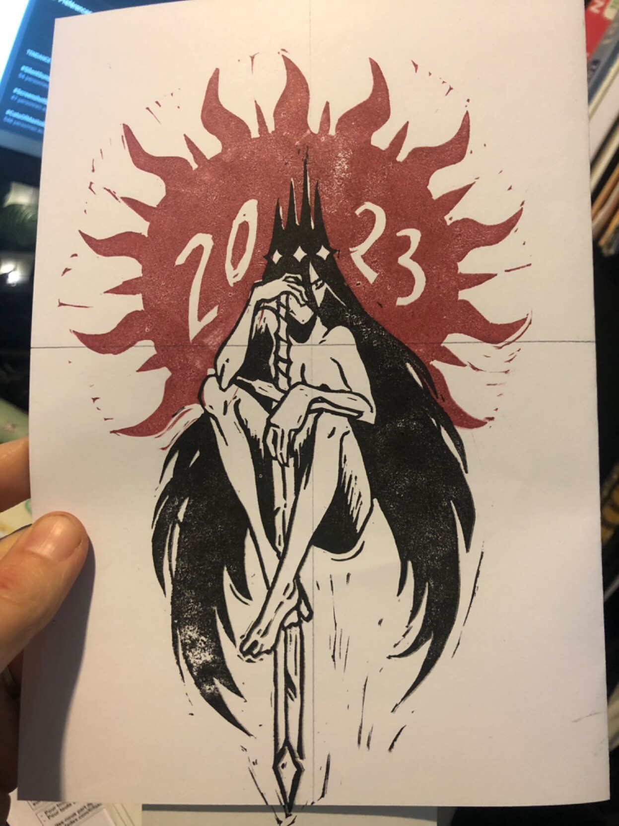 After some more struggles, here it is ! I think that’s the best I will do… Time to do some house chore before getting back to it, I will clean the stamp a little and will do the red sun print, maybe I will stream it ? Will see #Wip #Linocut #PrintMaking #NewYearCard