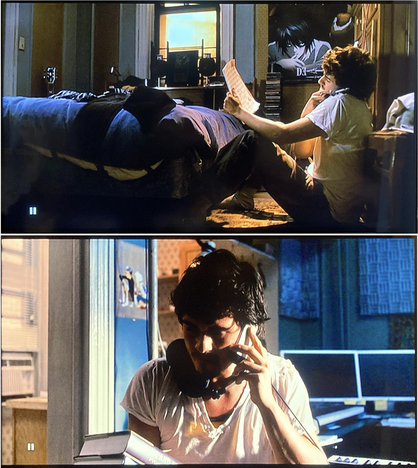 In camera da letto ha un poster di “Death Note”, in cucina un acetato di un film d’animazione che non mi sembra di riconoscere: @matteoB, è quel disegno affisso allo stipite azzurro, che ti sembra? #newyorkiloveyou