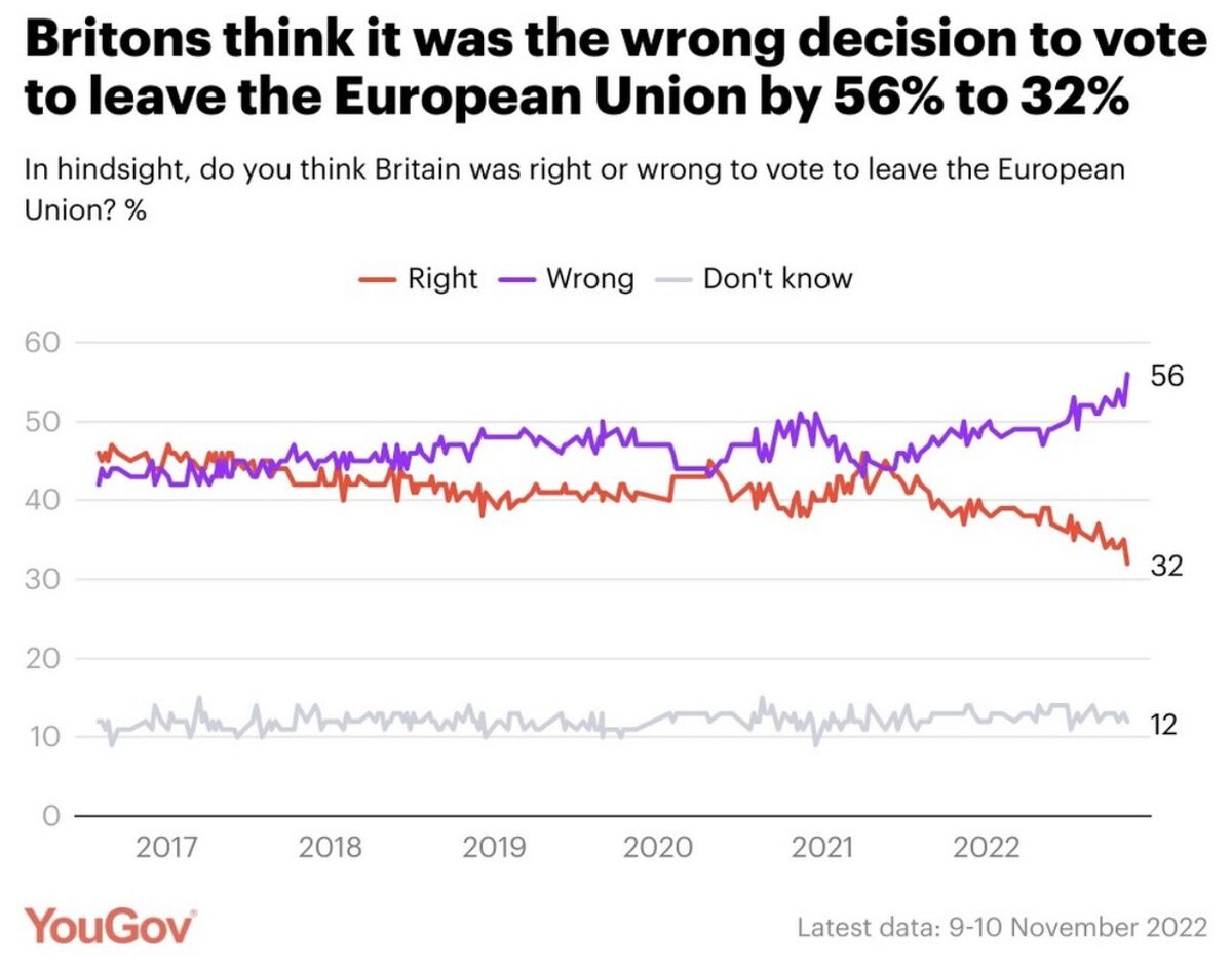Kijk. De Britten raken er steeds meer van overtuigd dat de Brexit niet zo’n goed idee was, peilt onderzoeksbureau @YouGov@twitter.com