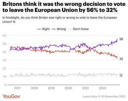 https://sailing-dulce.nl/home/article-7995 #BrexitChaos #Referemdum #NEXIT Zondag 29-01-2023 Hoe denken de Britten nu over de #Brexit? Steeds negatiever, 56 procent van de mensen heeft er nu spijt van. Er is niets beter en het leven is alleen maar duurder geworden. De 350 miljoen pond die elke week naar Brussel ging, zou beter besteed kunnen worden, zeiden de Leave-aanhangers toen, bijvoorbeeld aan de gezondheidszorg. Maar waar zijn die ponden gebleven? De zorg in het VK staat er beroerder voor..