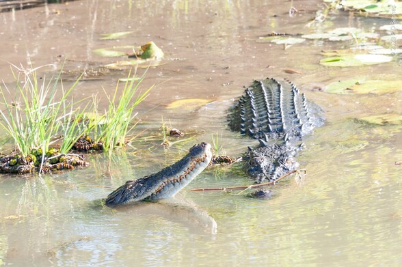 Spoiler: the adult wasn’t appeased, and lunged for the juvenile, who escaped in a swirl of brown water.
