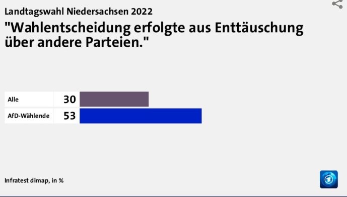 99 Prozent der #AfD-Wähler*innen bei der #Niedersachsenwahl gaben an, sie finden es gut, dass dass die Partei den "Zuzug von Ausländern und Flüchtlingen stärker begrenzen will". Da sage mir noch jemand, man könne das verharmlosend als "Protestwahl" bezeichnen.