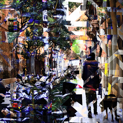 Superimposed layers of cut out segments from a textile pattern from a region on earth where people are currently fleshing out human incomprehension, i.e. anywhere?