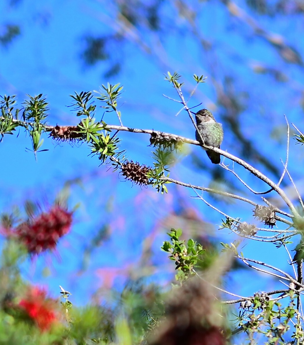 Gray and green hummingbird profile resting on a branch with blue sky background