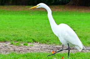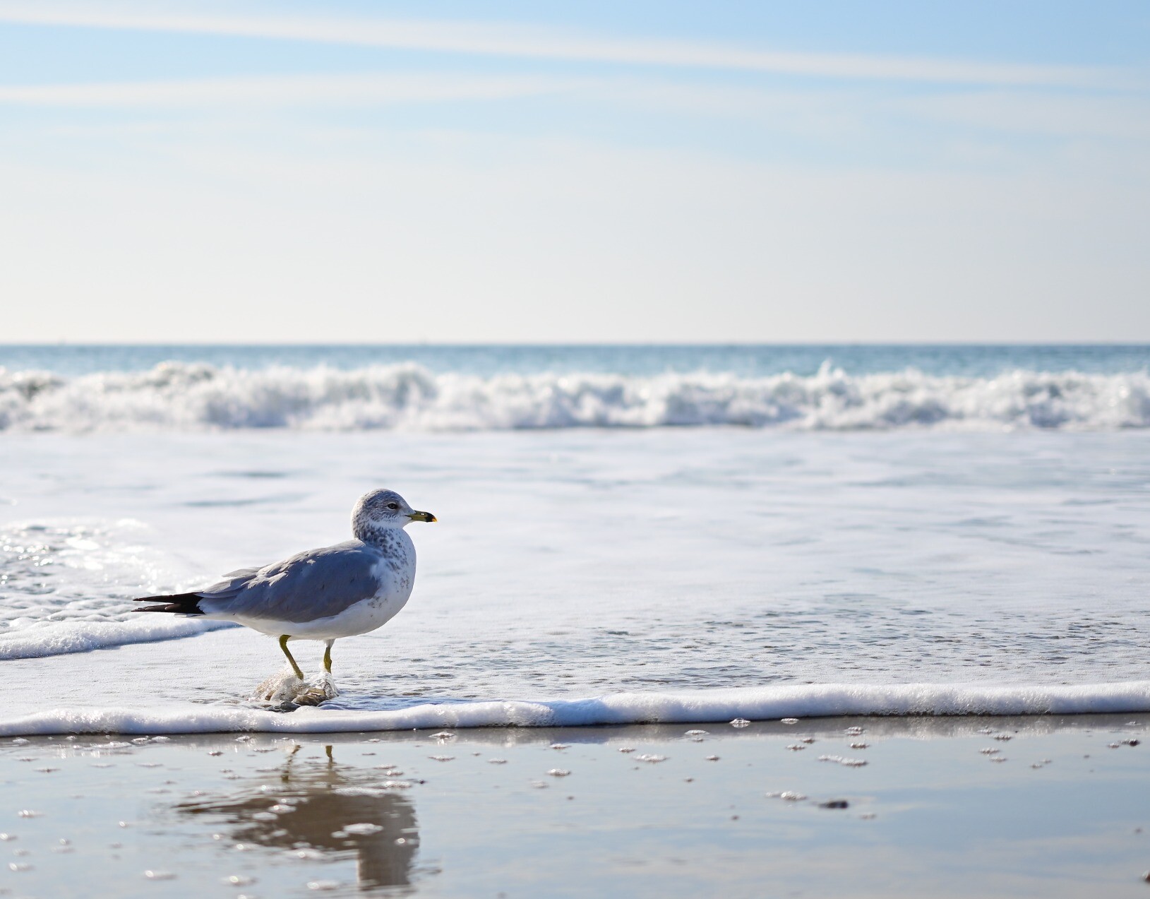 Profile perspective of a seagull walking through the foamy waves on the beach