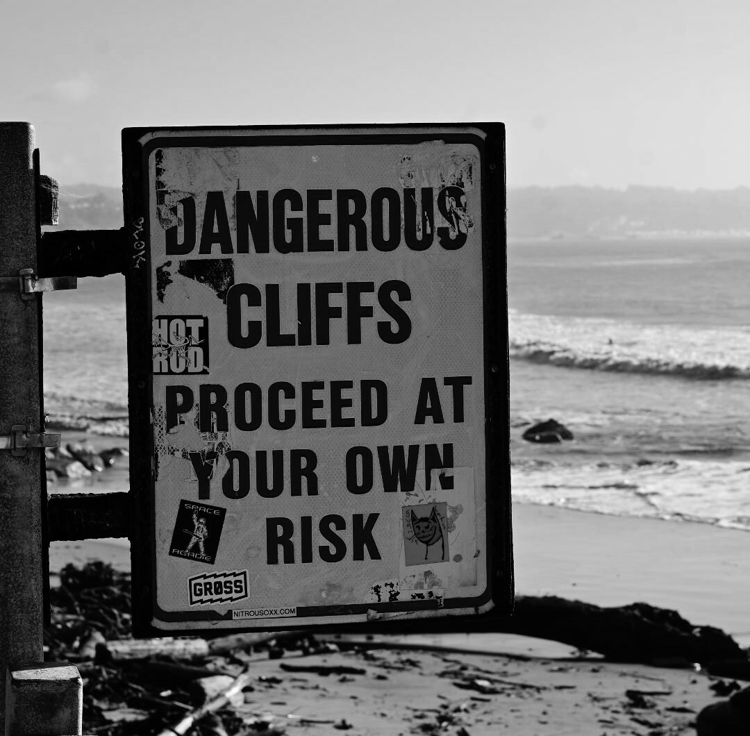 "Dangerous Cliffs Proceed at Your Own Risk" sign. Capitola beach in the background
