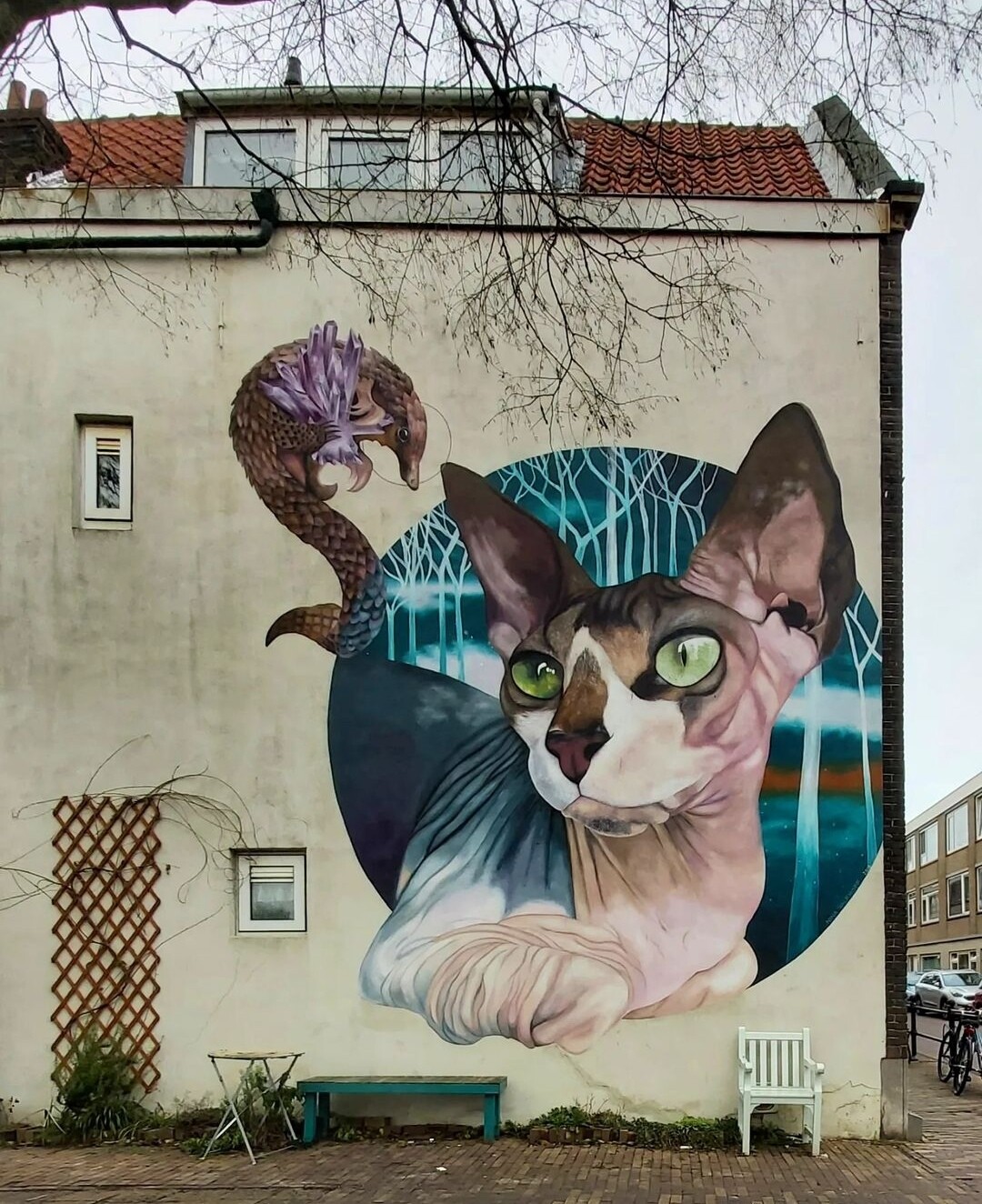 ( #NinaValkhoff ) in City: #Rotterdam Zuidhoek 71A (corner Voornsestraat), Netherlands 🇳🇱 - Title: "Sphynx Cat" - (📷 by #RianNijssen ) - #Streetart #Art #Mastoart #Mural #Sphynx #Cats #CatsofMastodon