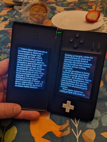 I love the form of my #R4, homebrew-running #NintendoDSLite. Folds up, goes in the pocket. I'm thinking of how cool it would be to have a folding, #OpenSource #ereader... 🤔