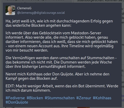 Die Instanz #Digitalcourage zu #sperren, die solchen Typen Heimat, Unterstützung und Deckung gibt, erweist sich ein weiteres Mal als richtig.