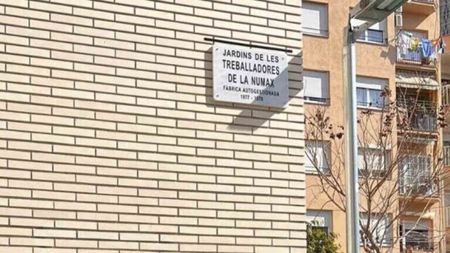 Esta mañana se ha realizado el acto de descubrimiento de la placa de Jardins de Treballadores de la Numax que dará nombre al interior de manzana del antiguo Cine Niza.