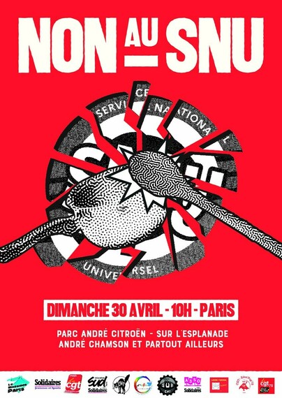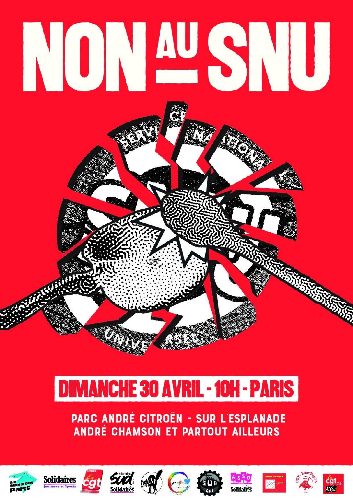 Ce dimanche à Paris, il y a une action contre le village du Service national universel (SNU) dans le 15e arrondissement. Un rassemblement est appelé par l'intersyndicale Solidaires-CGT-FSU à 10h au parc André Citroën. Ramenez vos casseroles ! #NonAuSNU