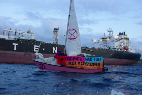 Oil tankers are blocked by XR activists in an oil port outside Bergen, Norway.