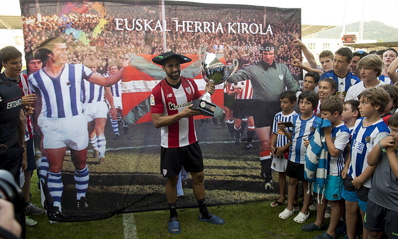 ➡️ Mikel Balentziagaren kirol ibilbidea laburbiltzen duen irudia: II. Euskal Herria Txapelako garaikurra jasotzen Irungo Gal futbol zelaian