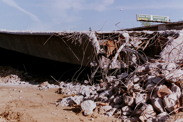 A bridge collapse along the 118 Freeway, north end of the San Fernando Valley, in the aftermath of the January 17, 1994 Northridge Earthquake. #earthquake #Northridge #losangeles