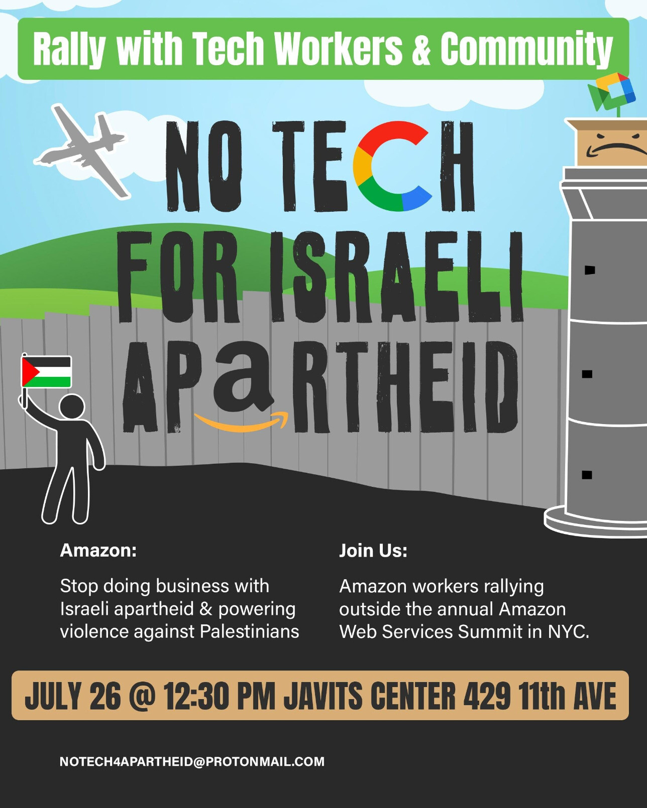 Demand No Tech For Apartheid at NYC Amazon Web Services Summit next Wednesday, July 26th at 12:30 pm at Javitz center. #notechforapartheid.