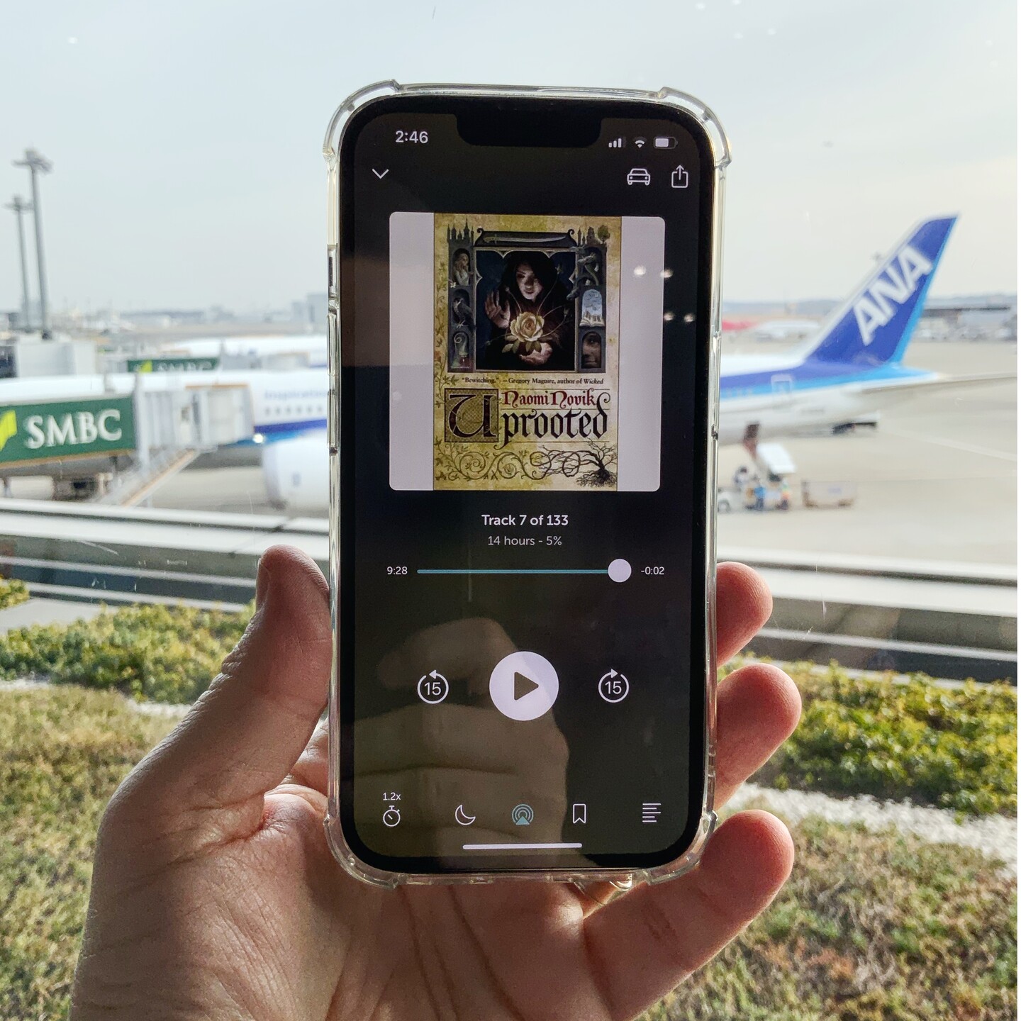 Since I am terrible at reading on moving vehicles, and I wanted something light to doze to, I got Naomi Novik’s “Uprooted” to listen to in the plane to YVR. #NowReading2023