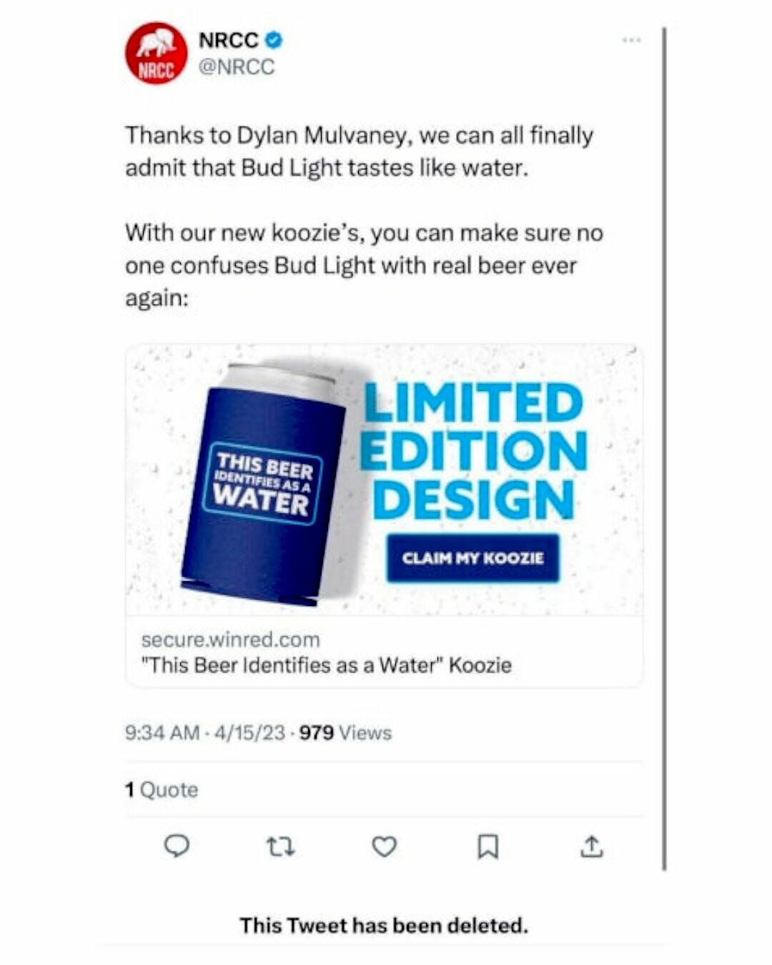 The National Republican Congressional Committee, having posted this anti-LGBTQ tweet just this morning, deleted it once they were made aware that #Budweiser is actually a top donor to the #RepublicanParty. Essentially, they were "biting the hand that feeds them"