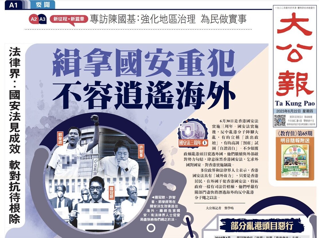 Pro-Beijing Ta Kung Pao runs a full A1 report citing legal-political figures urging the police to arrest #NSL suspects from abroad eg @nathanlawkc @denniswhkwok and @tedhuichifung . The report highlighted #NSL’s extraterritorial power on non-HKers and suggested asking InterPol. https://nitter.hongkongers.net/XinqiSu/status/1671688212052426754#m