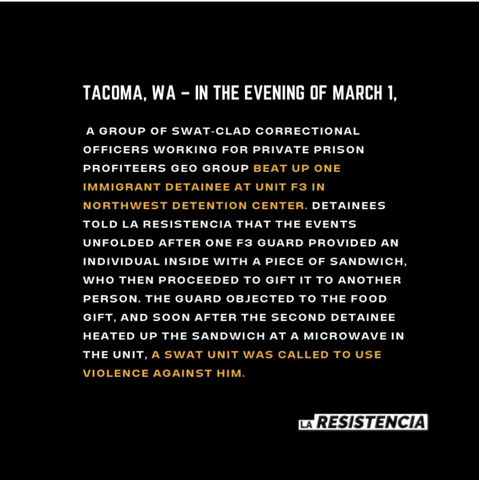 Mere weeks after brutally gassing detainees, SWAT unit violently attacked immigrant detainee simply for trying to eat a sandwich; pattern of brutality continues. Join us Sat March 4 12-1pm for a #solidarityday with MECHA, PSU, SAARPR, FRSO from UW to demand immediate releases, investigation of the assault, #ShutdownNWDC.