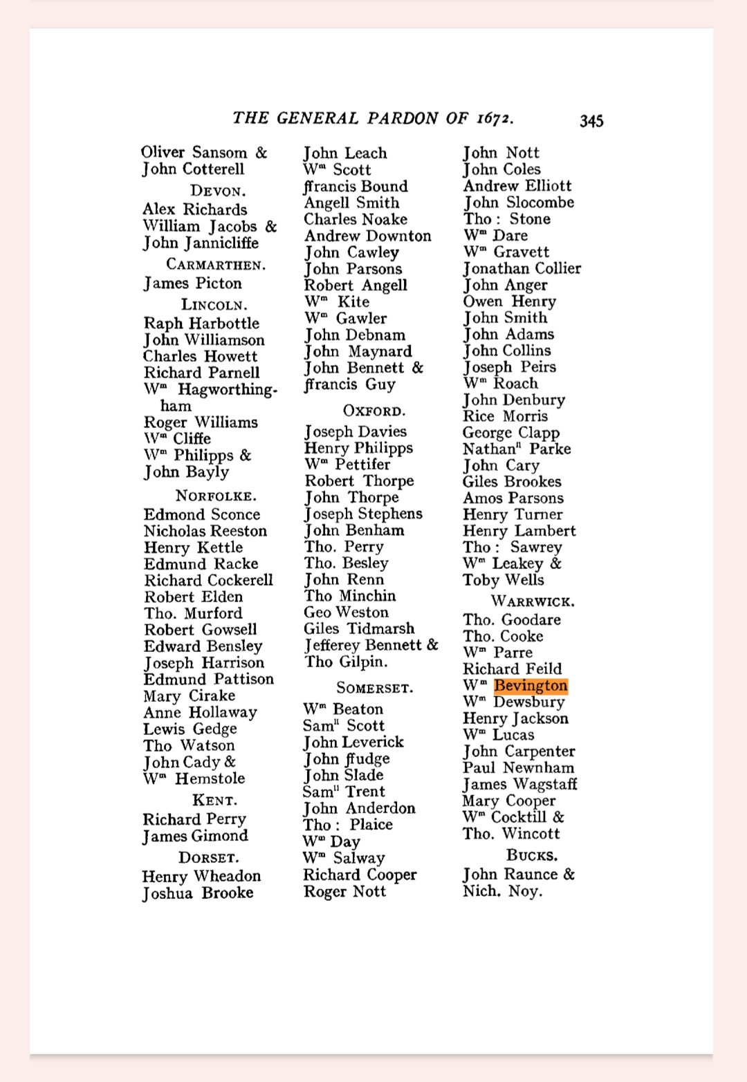 I'm proud of a seventeenth century ancestor of mine, William Bevington, a Quaker from Warwickshire, who in 1672 was released after years of imprisonment, after finally receiving a General Pardon.