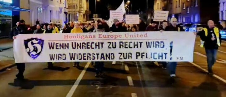 Das Fronttransparent ist das der "Hooligans Europe United". Die Aufmärsche in OB gehen weiter mit deutlich offener rechtem Auftreten was zu erwarten war. Einige bekannte Nazihooligans vor Ort. Aggressive Widerstandsrufe.