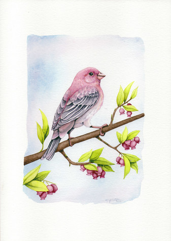 Octobre rose m'a inspiré l'aquarelle d'un petit roselin. Je la propose à 45€. 50% seront reversés à la ligue contre le cancer.