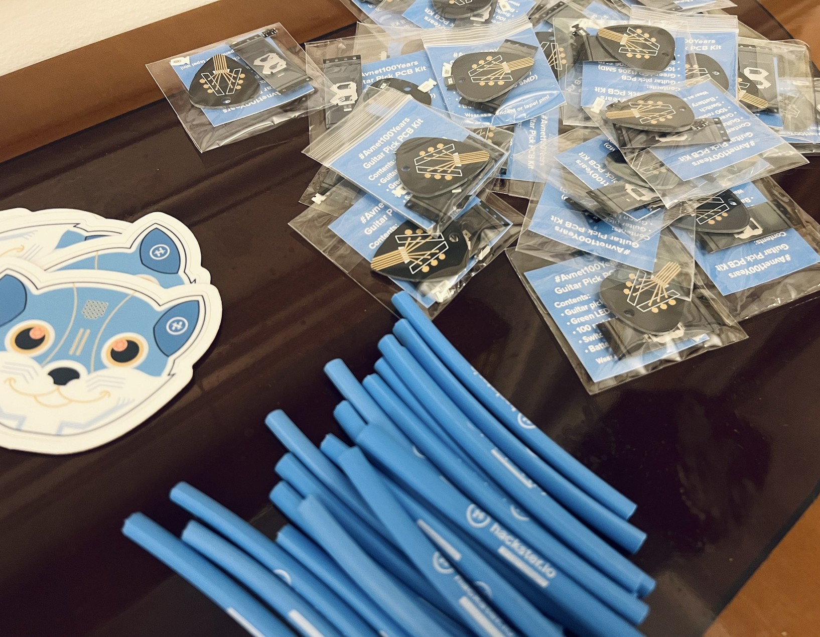 Come grab some @Hacksterio / @Avnet guitar pick PCB kits, heat-shrink, and stickers! In the workshops room at #OHSummit ⚡️⚡️