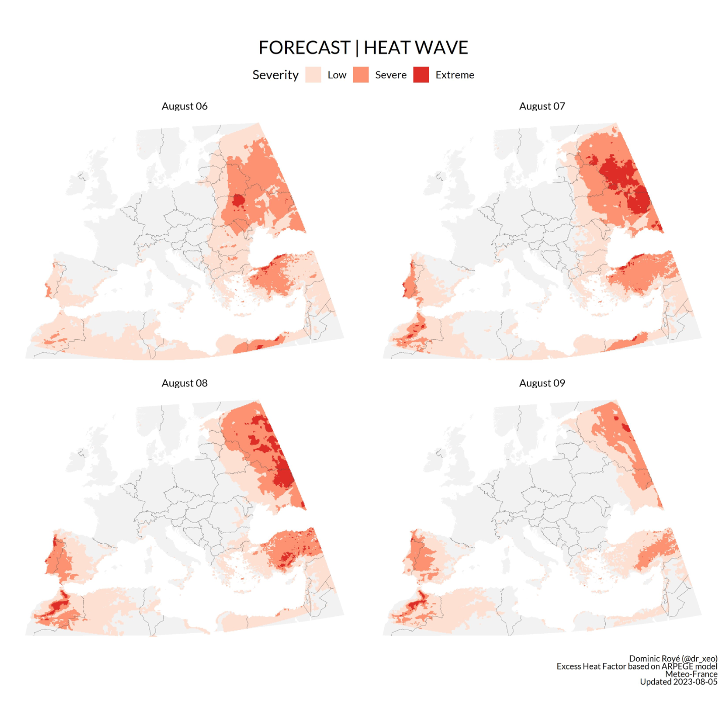 Así será #OlaDeCalor prevista los próximos días según el índice EHF. Afectará con mayor gravedad al oeste de la Península. En Portugal el 50-70% del territorio se verá afectado por una ola de calor grave, particularmente el martes. En cambio en España será el 23% el miércoles.